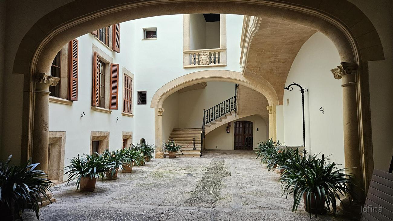 Vorbei laufen wir an der anliegenden Parkanlage, werfen noch einen Blick in den Garten des Bischofs, in einen Innenhof und dann geht’s zielstrebig zum schönen Rathaus von Palma.