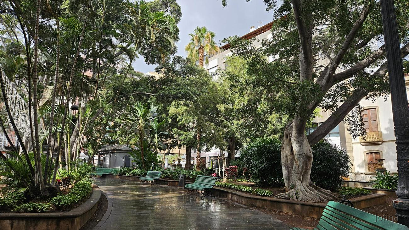 Eine Parkanlage mit Blick auf die Kirche San Blas