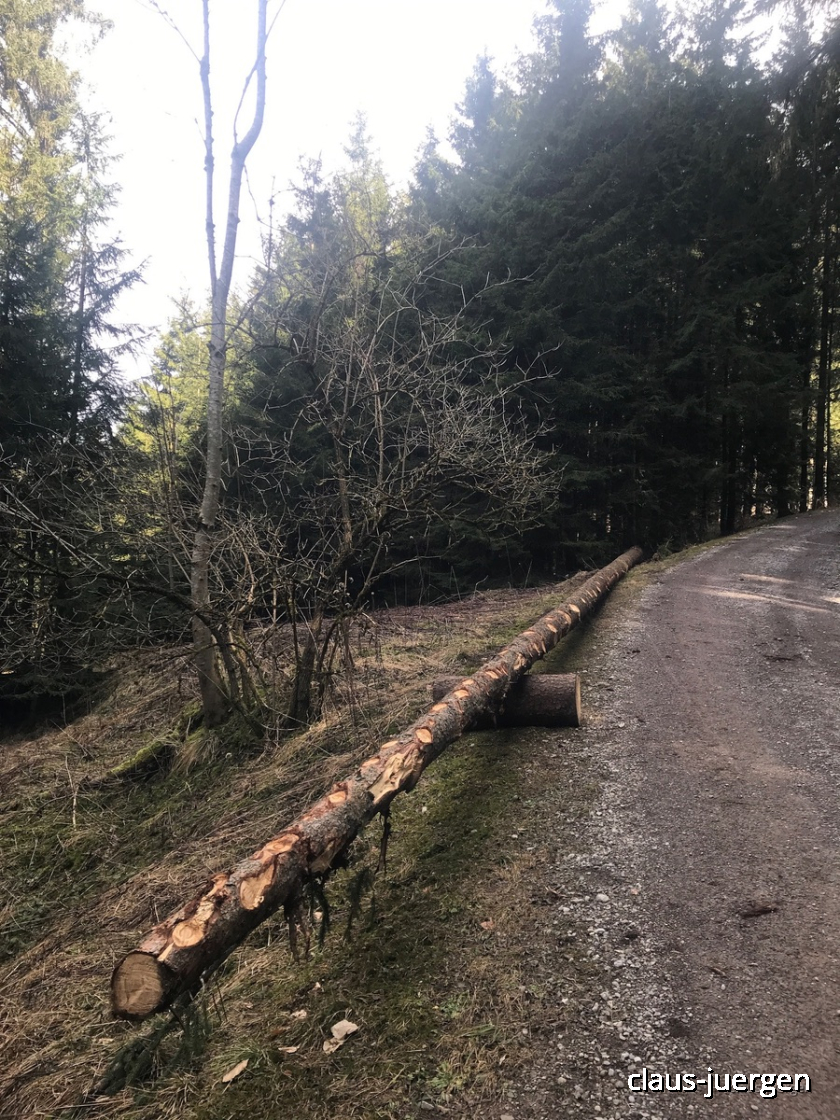 Die Jugend von Rieden oder einem anderen Dorf im Umkreis hat sich hier einen passenden Baum als Maibaum ausgesucht. Der lagert an dieser Stelle bis er im Dorf geschmückt wird.