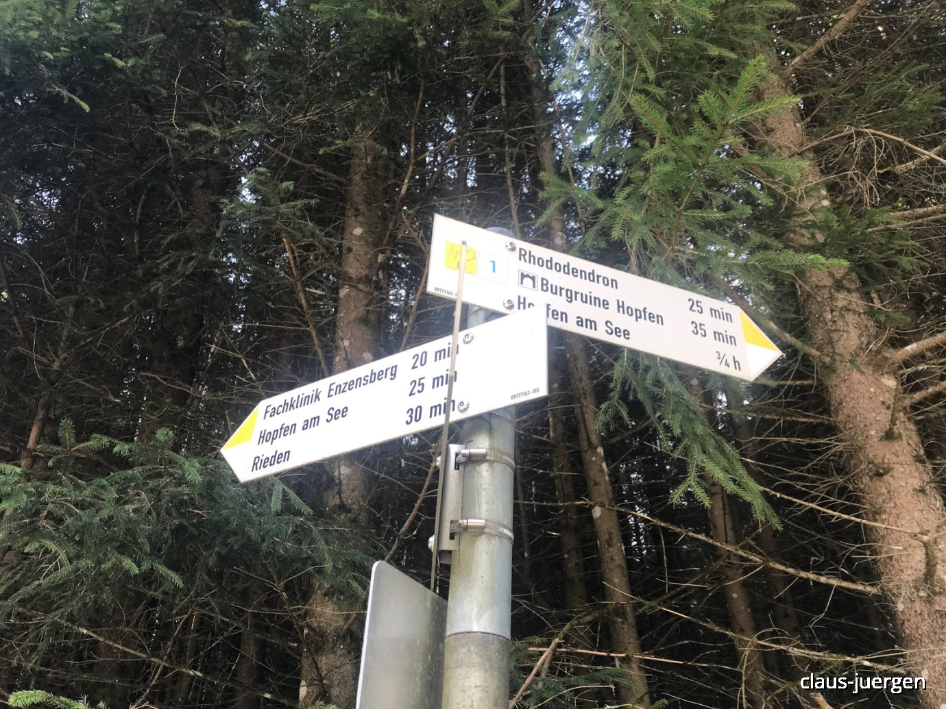 Es gibt mehrere Varianten dieser Rundwanderung von Rieden über die Burgruine Hopfen, den Hopfensee und Enzensberg. Unsere Tour hat einschließlich einer ausgiebigen Rast vor dem Dorfladen etwa drei dreiviertel Stunden gedauert. Im Juni empfiehlt sich zudem ein Abstecher zu den blühenden Rhododendren.