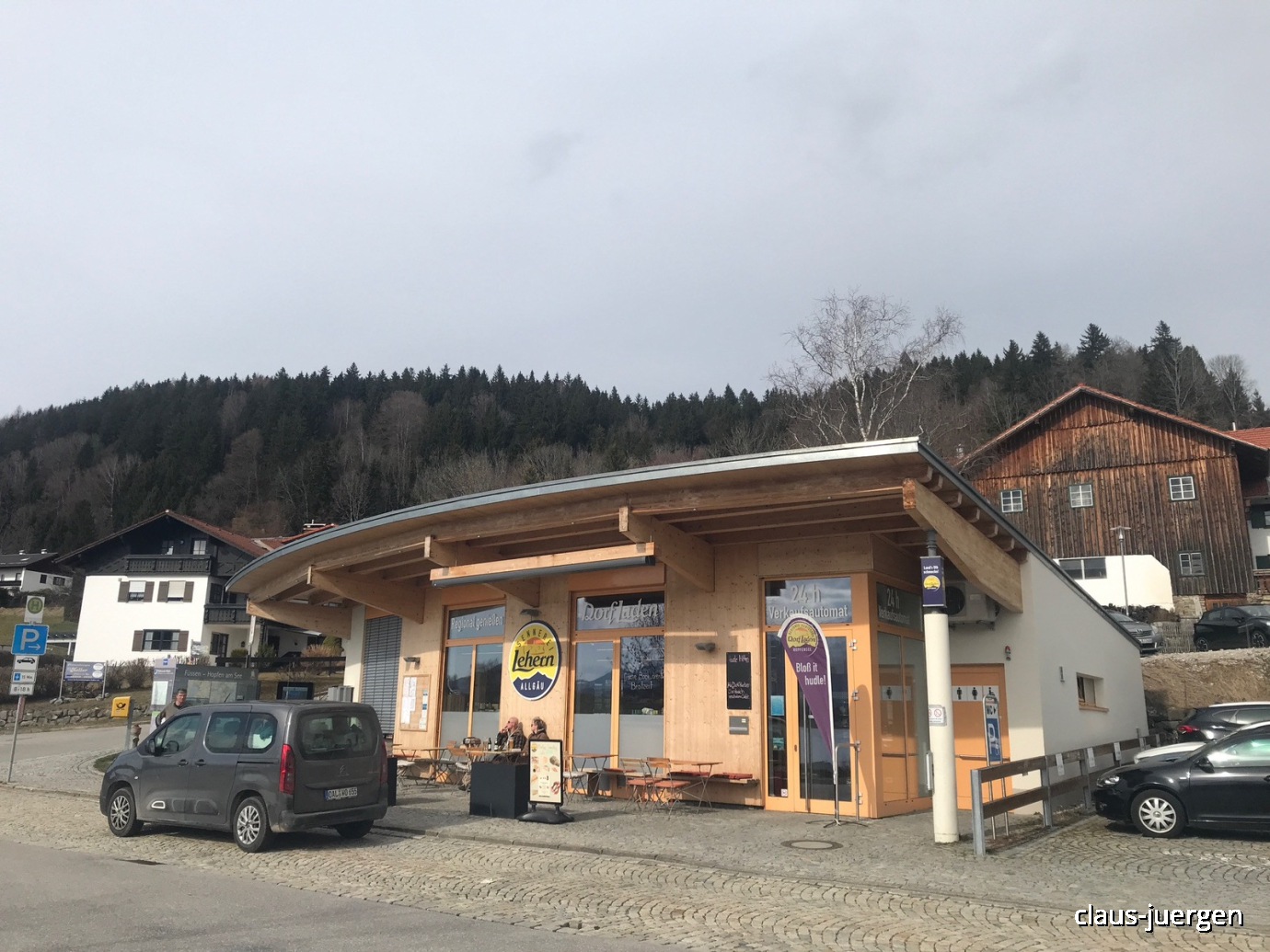 Wir genießen unseren Latte Macchiato vor dem Dorfladen. Die Preise dort sind etwa halb so hoch wie in den anliegenden noblen Restaurants.