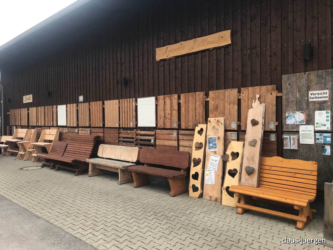 Der Betreiber des örtlichen Sägewerks hat eine Marktlücke gefunden und stellt aus Holz verschiedene Gegenstände her die direkt ab Werk verkauft werden.