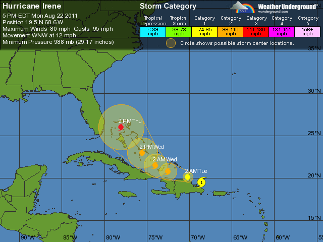 Hurricane Irene wurde zu Kath. 3 hochgestuft und es wird damit gerechnet, dass der Hurricane im laufe des morgigen Tages zu Kath. 4 hochgestuft wird. Da wird er dann Winde von 170 mph (Meilen) erreichen.