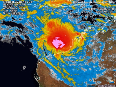 Der Tropical Cyclone Lua wird morgen zu einem Taifun hochgestuft und wird wahrscheinlich als ein Taifun der Stärke 2 in etwa zwischen dem 18. und 19. März auf Australien einschlagen. Er hat dabei Winde von 110 mph im Mittel und er schiebt in etwa 15 Meter hohe Wellen vor sich her.