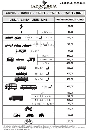 Die Fährfahrt ( einfach) für einen normalen PKW kostete 2011 140 Kuna .Hin und zurück : 280 Kuna.