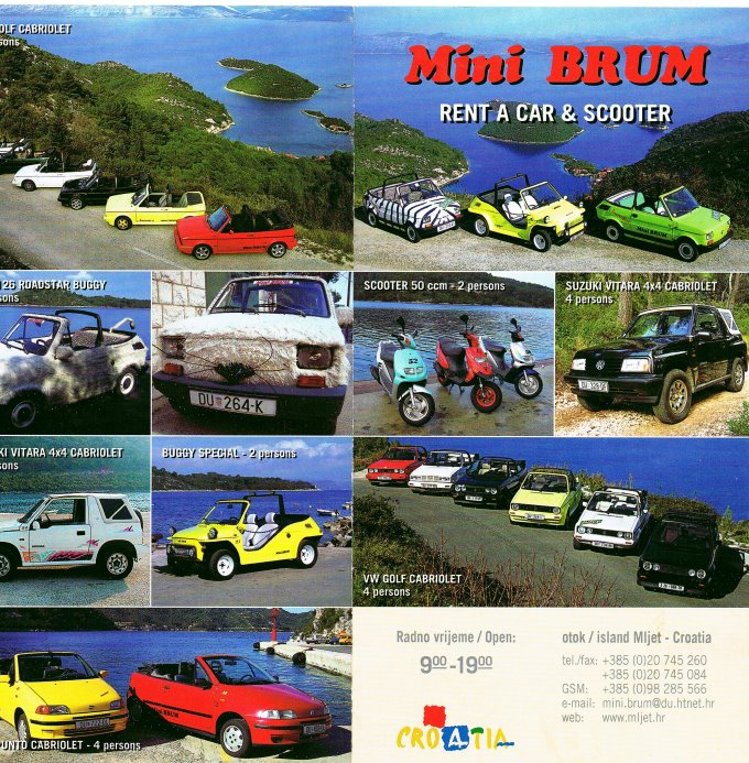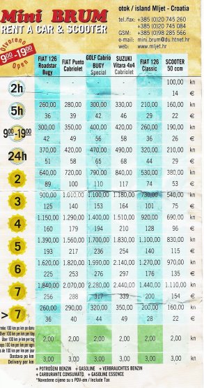 Am Hafen von Sobra auf Mljet stehen kleine Mietautos: Von 11 Uhr(Ankunft der Fähre) bis 16 Uhr ( Rückfahrt) : 280 Kuna – ohne Benzin ( am Hafen ist eine Tankstelle, wo man vor der Rückgabe wieder volltanken kann)