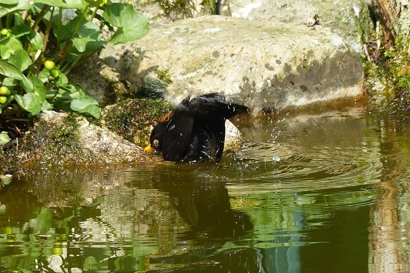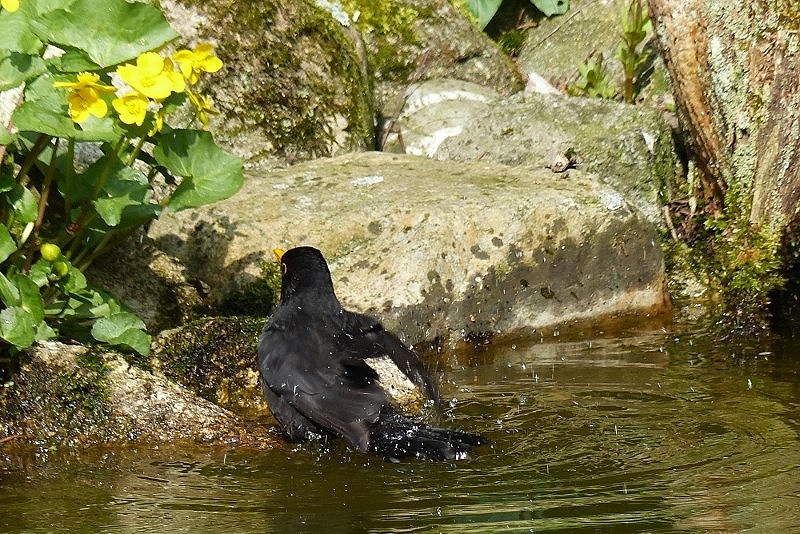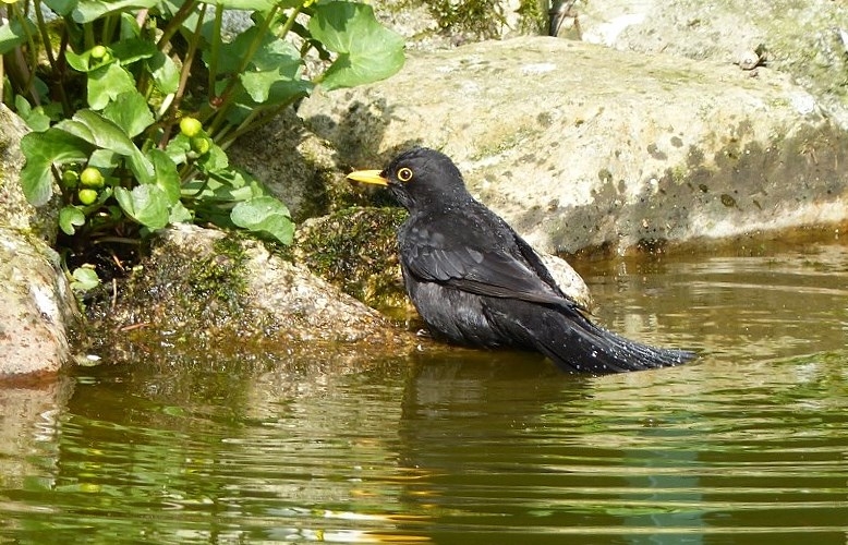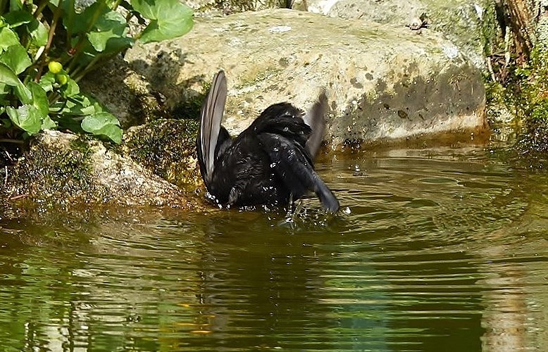 Natürlich genießt das Amselmännchen schon gleich mal die für ihn ausladende Badelandschaft.