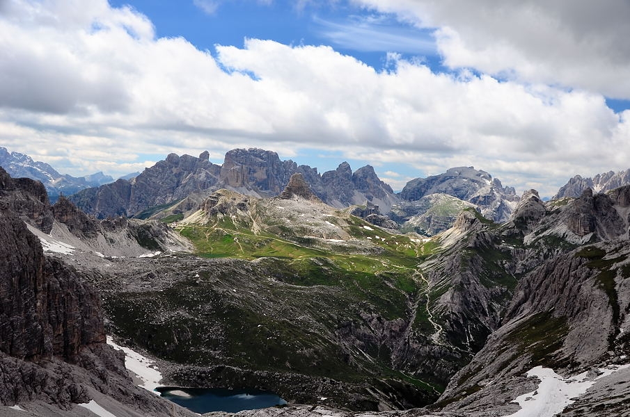 Wieder eröffneten sich ganz andere Ausblicke. Im Hintergrund die „Gruppo Delle Marmarole“ und die „Cadini Di Misurina“.