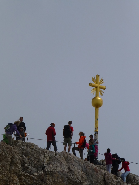 schönen Blick auf das Gipfelkreuz und ein paar Leute, die sich an Deutschlands höchster Stelle fotografieren oder die Bergdohlen füttern.