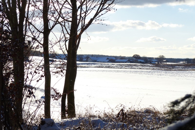 Ebenso schneeweiße Ackerflächen, in deren Hintergrund sich schon auf den Dächern des Dorfes der Nachtfrost sichtbar ankündigt und abgeschwächte Sonnenstrahlen, die ein konturenreiches Wolkenbild vermitteln , ins Bild gerückt.
