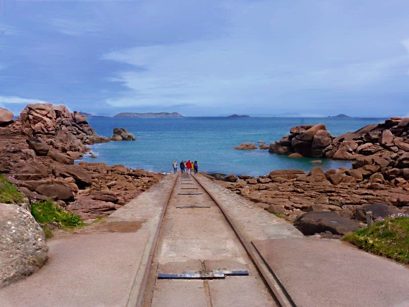 das ist richtig. Aufgrund des hohen Tidenhubs von über 10 Metern war es erforderlich, daß die Slipanlage jederzeit, auch bei extremem Niedrigwasser nutzbar ist. So wurde diese Slipanlage sehr weit rein ins Meer gebaut. Das Rettungsboot ist gar nicht so klein und läuft auf Schienen an einem Drahtseil geführt ins Meer.