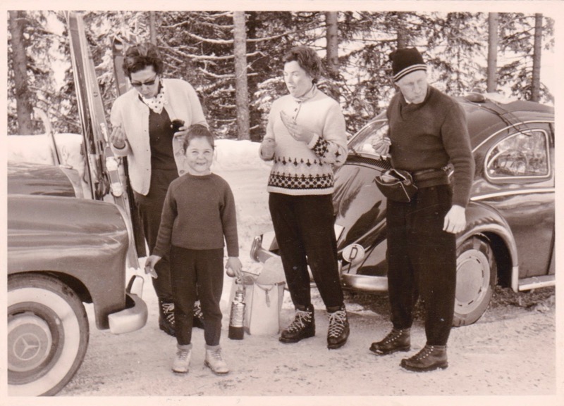 Ich fand Autofahren großartig und besonders dieses Auto, denn am Armaturenbrett in den Lüftungsschlitzen hing eine trichterförmige Glasvase mit bunten Plastikblümchen, die ich jedes Mal aufs Neue bestaunte und mir gerne näher angesehen hätte. Aber ich als kleinster Passagier wurde im Käfer in der Mulde hinter den Rücksitzen transportiert. Ich musste mich ganz klein machen, damit der Fahrer durch die Heckscheibe nach hinten sehen konnte. Viel Ausblick bot sich für ihn allerdings nicht, denn die Skier waren am Heck des Autos befestigt und versperrten die Sicht. Ich liebte es, auf diese Art und Weise kutschiert zu werden, denn ich hatte es als Einzige ganz nah am Motor kuschelig warm.