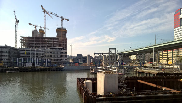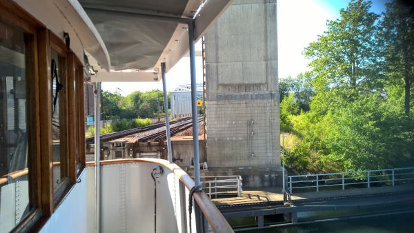 Alle wieder an Bord, wir passieren Trollhättan und eine Eisenbahnbrücke, die für uns hochgezogen wird.