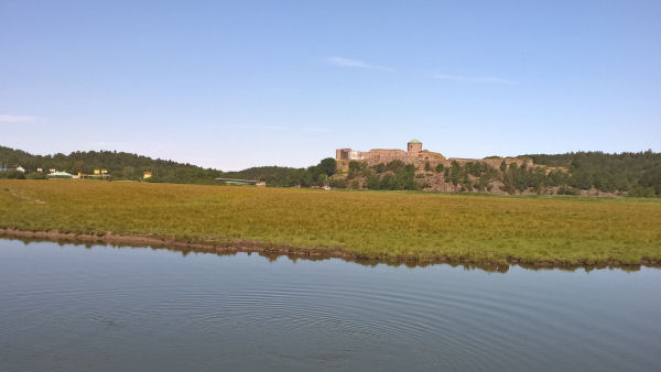 Vorbei an dem Hochhaus mit dem Spitznamen Läppstick, auf dem ich schon mal oben war (der verlinkte Beitrag ist nicht von mir) und an einer der zahlreichen Göteborger Großbaustellen verabschieden wir uns von Göteborg und tuckern den Götaälv hoch. Bis wir in drei Gruppen (zwei deutschsprachige und eine schwedisch/englische) nacheinander nach der Begrüßung durch Kapitän Albert und Gästebetreuerin Caroline unsere Einweisung bekommen haben, kommt schon die Festung Bohus in Sicht.