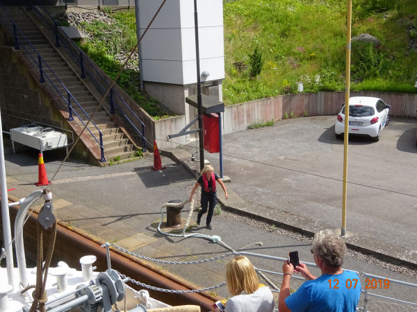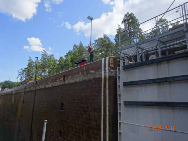 Das Schleusen ist ein komplizierter Vorgang. Das Schiff muss in die Schleuse einfahren und dort festgemacht werden. Nachdem beide Schleusentore geschlossen sind und das Wasser ein- oder abläuft, muss während dieses Prozesses kontinuierlich Seil zugegeben oder nachgezogen werden, damit das Schiff keine unkontrollierten Bewegungen macht. Da sich das Schiff an der Schleusenmauer "reibt", braucht es Stoßdämpfer, sogenannte Fender, die bei der Juno aus Birkenholz sind und regelmäßig ausgetauscht werden müssen - dazu später. Jetzt geht es erstmal durch mehrere Schleusen bis in den Trollhätte-Kanal, und dann dürfen wir zum ersten Mal "raus".