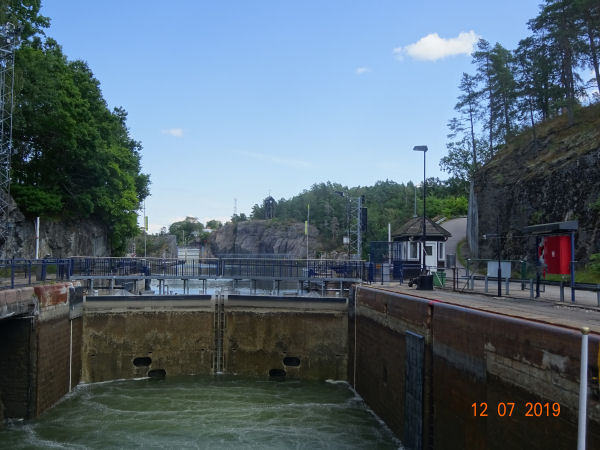 Der Trollhätte-Kanal ist wesentlich breiter als der spätere Göta-Kanal und wird im Gegensatz zu diesem auch von der kommerziellen Schifffahrt genutzt, wie wir gleich sehen werden. Durch die Schleusen im Göta-Kanal passen oft nur die "Juno" und ihre Schwesterschiffe - dieser Monstertanker, der uns ordentlich Verspätung einbringt weil er nur zentimeterweise bewegt werden kann, hätte da keine Chance gehabt.