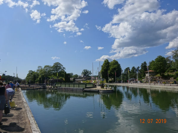 Der Festung kommen wir noch etwas näher, das Thorhogs Slott muss ich Euch leider vorenthalten, da bekamen wir wohl grad unser Mittagessen serviert. Und schon taucht die erste Schleuse vor Trollhätten auf. Ein paar Schleusungen höher legt die "Juno" an und wir dürfen, zum Besuch des Kanalmuseums und um uns die alte Schleusentreppe anzuschauen, von Bord.