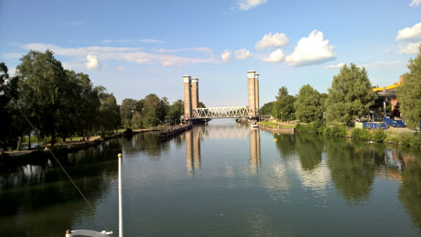Alle wieder an Bord, wir passieren Trollhättan und eine Eisenbahnbrücke, die für uns hochgezogen wird.