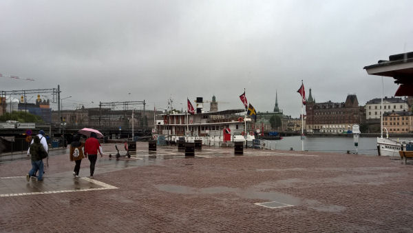 In unmittelbarer Nähe des Rathauses legen wir an. In strömendem Regen verabschiedet sich die gesamte Crew, nunmehr wetterfest gekleidet, von jedem/r einzelnen Passagier und hilft uns beim Ausladen des Gepäcks, das heisst, sie übernehmen die schweren Stücke.