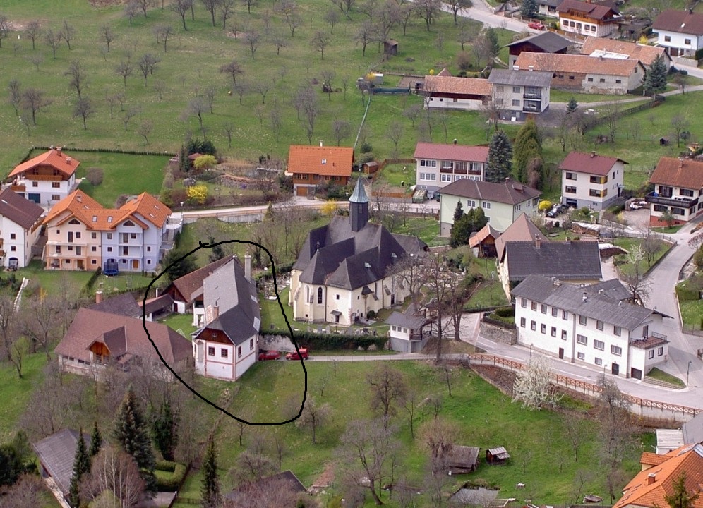 Wir fuhren trotzdem los - und ich kann und muss Euch nun den Blick - vom Aussichtspunkt aus - auf das Ensemble Kirche und Pfarrhof (er stammt wie die Kirche ebenfalls aus dem 13. Jahrhundert) zeigen. So wie es bis gestern aussah und wie es sich heute zeigt (im Garten liegen noch die Schläuche und man sieht vor der Kirche noch die Feuerwehr stehen).
