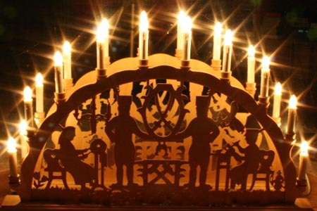 Bergmann und Engel in den Fenstern, sowie Schwibbogen kenne ich .Ein schöner echter Schwibbogen hat vor ca 50 Jahren auf wundersame Weise den Weg von Zwickau in der DDR zu uns in "den Westen" gefunden. Das war seinerzeit äußerst schwierig, daher ist er jetzt für mich so kostbar. Er wird sorgsam gehütet und zu Beginn der Adventszeit aufgestellt.)