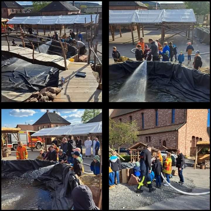Die Jugendfeuerwehr hat begonnen den Unkenteich zu füllen und viele Helfer haben den Rindenmulch ausgebracht..